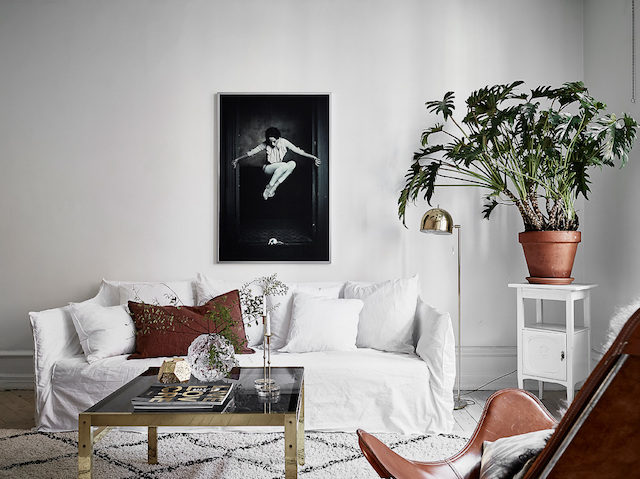 In this lovely apartment in Gothenburg, the designers have decided to make smart use of the very small space by doubling the bedroom up with storage space in the living room. The door can be closed for privacy and a cosy feel at lights out - while the windows still allow a little light to slip in (thankfully or I might start to feel more than a little claustrophobic!). The rest of the apartment has beautiful high ceilings and large windows which flood the space with light - and a beautiful white, grey cognac and brass combination. Let's take a peek....