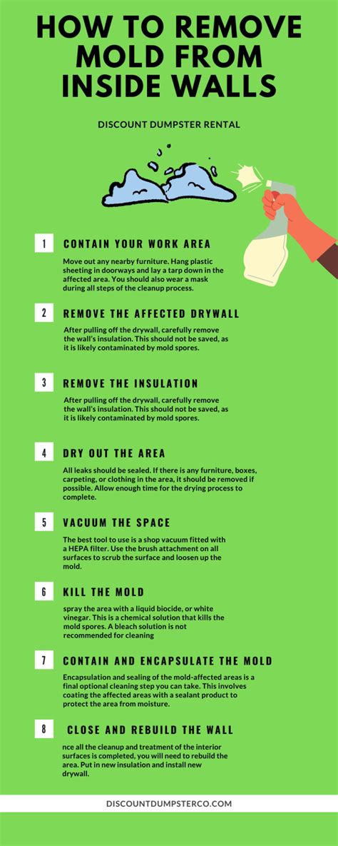 Removing mold from inside walls is a daunting task, but it is important to take action as soon as possible to prevent it from spreading further. By following these tips, you can safely remove mold from inside walls and prevent it from growing back. Remember to wear protective gear, prepare the area, and dispose of contaminated materials properly.